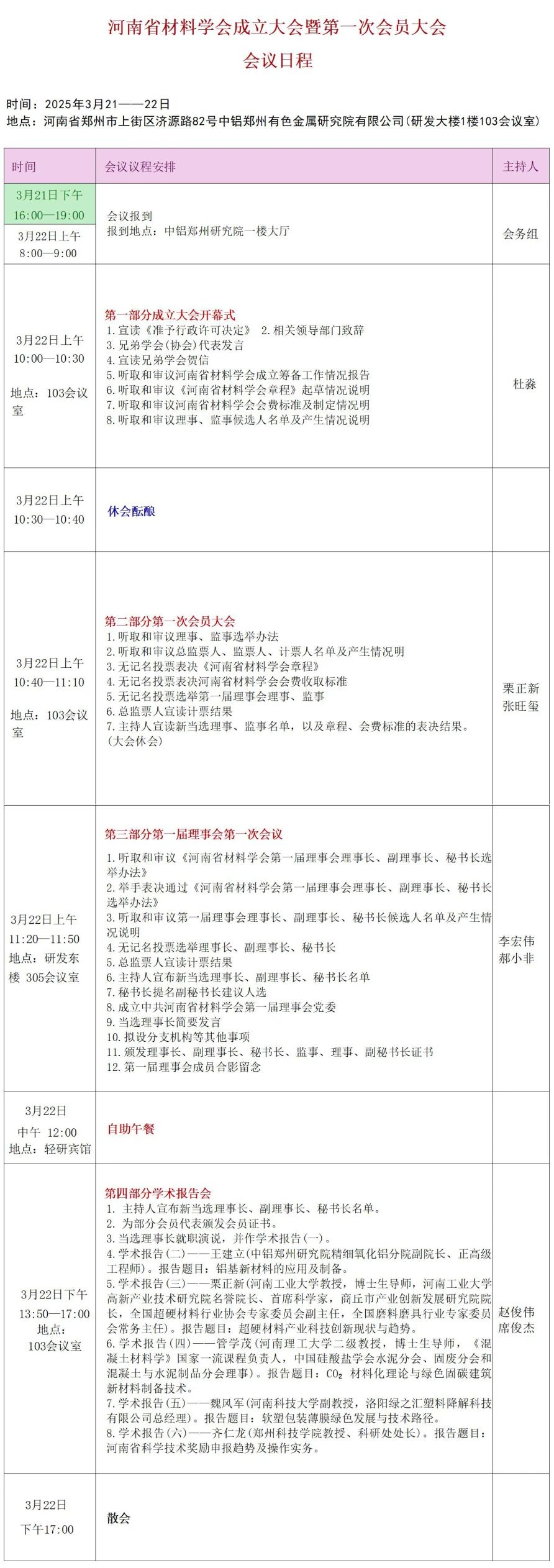 河南省材料學會成立大會暨 第一次會員大會會議通知 各會員、各有關單位: 河南省材料學會已經(jīng)河南省民政廳批準成立,取得社會團體登記證書;并經(jīng)主管單位河南省科學技術協(xié)會批準同意召開成立大會。根據(jù)相關程序和要求,茲定于2025年3月21~22日在河南省鄭州市召開河南省材料學會成立大會暨第一次會員大會。現(xiàn)將有關事宜通知如下。 一 、學會簡介 河南省材料學會是由在河南省內注冊或舉辦的工業(yè)企業(yè)、高校、科研院所和新型研發(fā)機 構、材料儀器設備研發(fā)和銷售、材料科技服務機構等相關材料科技工作者自愿聯(lián)合結成,并依法登記成立的全省性、學術性、非營利性社會組織。學會的業(yè)務主管單位是河南省科學技術協(xié)會,登記管理機關是河南省民政廳。 本會堅持中國共產(chǎn)黨的全面領導,遵守憲法、法律、法規(guī)和國家政策,旨在團結和組織河南省材料科技工作者,致力于材料科學與技術的進步與交流,推動新質生產(chǎn)力的快速發(fā)展, 促進材料科學與工程技術的繁榮和發(fā)展,普及和推廣材料科學技術,提高材料科學技術人才的素質,促進科學技術與經(jīng)濟的結合,加強“產(chǎn)學研用”合作和協(xié)同創(chuàng)新,為全面推進中國式現(xiàn)代化建設河南實踐做出貢獻。 二 、大會時間和地點 時間:2025年3月21~22日。 會議報到時間:3月21日下午16:00-19:00,3月22日上午8:00-9:00。 成立大會于3月22日上午10:00開始。 會議地點:河南省鄭州市上街區(qū)濟源路82號,中鋁鄭州有色金屬研究院有限公司(以下簡稱中鋁鄭州研究院)研發(fā)大樓1樓103會議室。 參會人員如需住宿,請?zhí)崆邦A定中鋁鄭州有色金屬研究院輕研賓館,聯(lián)系電話:0371-68918425。差旅費和酒店住宿費用自理。 三、大會主要議程 河南省材料學會成立大會; 河南省材料學會理事、監(jiān)事及學會負責人選舉會; 學術報告會。 四 、會議注冊 1.報名方式:請用微信識別二維碼直接報名,報名截止時間為2025年3月20日。 2.學會會員需預收2025年會費,不再另外收取會議注冊費。會費標準如下:理事長會員5000元/年;副理事長會員4000元/年;理事會員3000元/年;普通會員100元/年。(有條件的可以一次性交納第一屆五年任期的會費) 3.非學會會員,需繳納會議注冊費500元/人。凡報名參會人員,大會將免費提供材料儀器設備會展、材料新產(chǎn)品推介、發(fā)布宣傳資料等服務。展位有限, 先報名先得。 4.歡迎材料領域相關人員參會見證。有需要新加入河南省材料學會的團體 (單位)和個人會員,可微信搜索公眾號“河南省材料學會”下載表格填寫信息, 或聯(lián)系會務組入會,聯(lián)系人:周夢笛,電話15236718196。 5.會員會費和會議注冊費收款信息河南省材料學會收款信息如下: 戶名:河南省材料學會 賬號:41050167590800002129 開戶行:中國建設銀行鄭州桐柏路支行 使用微信、支付寶繳費,可以直接掃碼識別河南省材料學會的微信、支付寶對公戶收款碼。 河南省材料學會微信、支付寶對公戶收款碼 (如使用公務卡需要進行微信、支付寶繳費,請?zhí)崆敖壎ㄣy行卡) 6. 會務組聯(lián)系人和聯(lián)系方式 郝博士(大會統(tǒng)籌)18837199918 樊瑞陽(會務統(tǒng)籌,河南新知儀器設備有限公司總經(jīng)理)13673392751 楊經(jīng)理(中鋁鄭州研究院)15713682242 周夢笛(會員登記、會務)15236718196 趙亞君(河南中創(chuàng)科技評價研究院院長)18638579968 朱天麗(河南省材料學會,發(fā)票) 13938229352(電話微信) 五、公共交通信息 1.鄭州東站:乘坐地鐵1號線,在鄭州火車站換乘地鐵10號線,到鄭州西站高鐵站C口出站,換乘 “鄭上2路”公交車到汝南路濟源路站下車,向東1000米。或乘坐5號線,在市中心醫(yī)院站換乘地鐵10號線鄭州西站高鐵站C口出站,再換乘“鄭上2路”公交車。 2.鄭州站:乘坐地鐵10號線到鄭州西站高鐵站C口出站,換乘“鄭上2路”公交車到汝南路濟源路站下車,向東1000米。 3.鄭州西高鐵站:有公交接駁車可到中原路鄭州西站高鐵地鐵站,換乘“鄭上2路”公交車到汝南路濟源路站下車,向東1000米。 交通導航可搜索目的地“中鋁鄭州有色金屬研究院有限公司”。 河南省材料學會 2025年2月6日