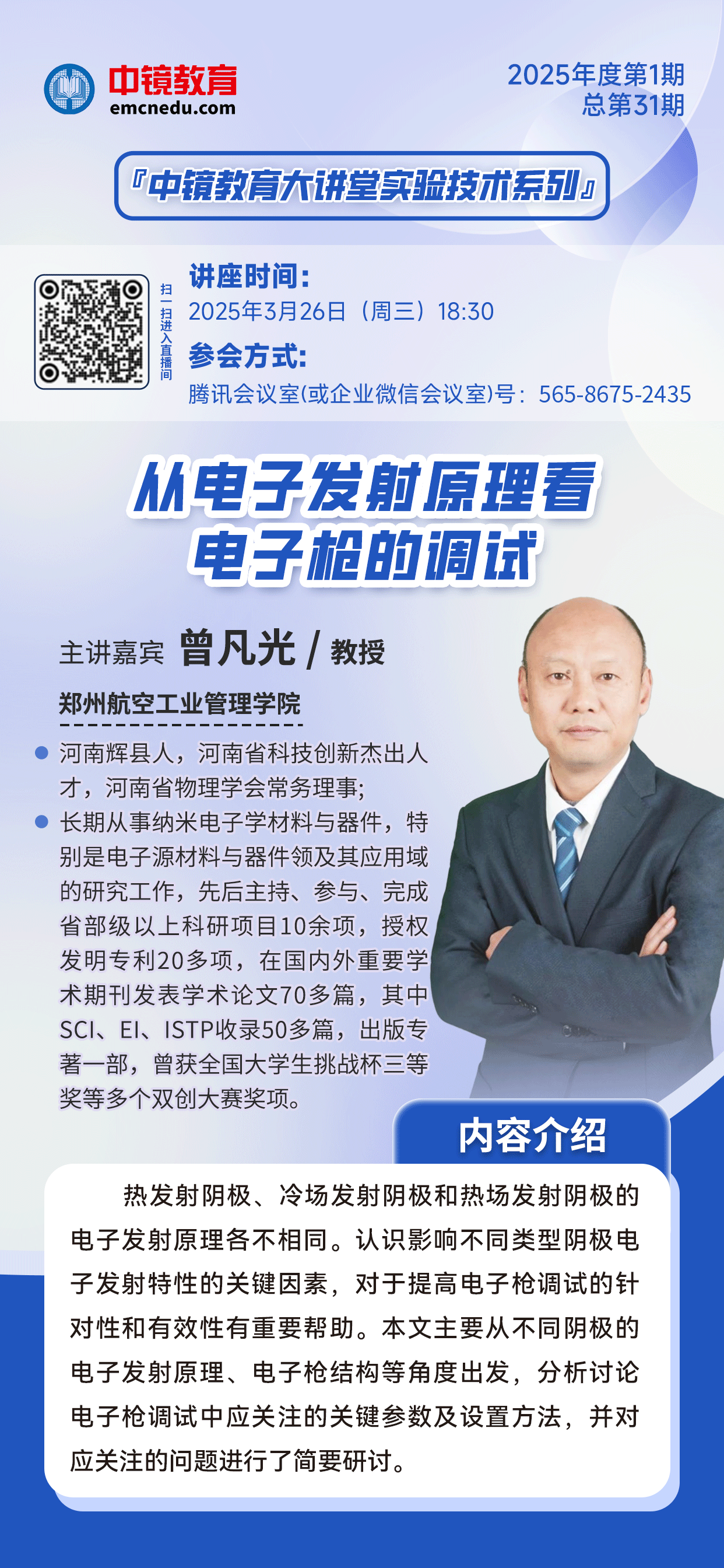 中鏡教育大講堂 實驗技術系列 2025年第1期(總第31期) 2025年“中鏡教育大講堂”第1期-“實驗技術系列”講座將于2025年3月26日18:30開講。本期由鄭州航空工業管理學院曾凡光教授帶來的《從電子發射原理看電子槍的調試》專題講座將從不同陰極的電子發射原理、電子槍結構等角度出發,分析討論電子槍調試中應關注的關鍵參數及設置方法,并對應關注的問題進行簡要研討。歡迎大家積極參與,共同推動實驗技術的發展! 講座時間: 2025年3月26日(周三)18:30 參會方式: 騰訊會議室(或企業微信會議室)號:56586752435 掃碼進入微信視頻號