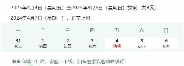 清明節是傳統的重大春祭節日,掃墓祭祀緬懷祖先,是中華民族自古以來的優良傳統,不僅有利于弘揚孝道親情、喚醒家族共同記憶,還可促進家族成員乃至民族的凝聚力和認同感。 放假安排 聯系我們