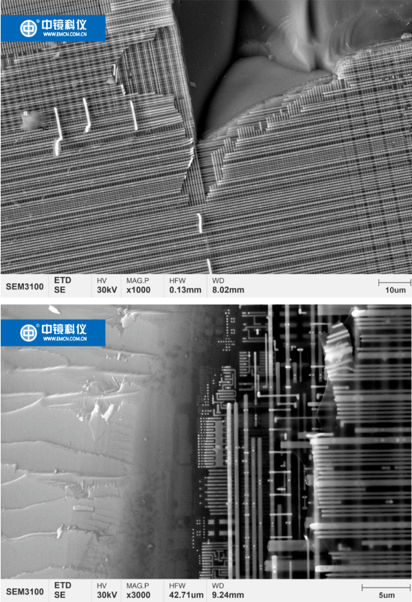近日,國內(nèi)芯片行業(yè)喜報連連,8月29日,華為搭載麒麟9000S芯片的Mate 60 Pro正式上線,該芯片上行峰值網(wǎng)速可以達(dá)到5G標(biāo)準(zhǔn)。標(biāo)志著華為突破1079天封鎖!麒麟芯片正式回歸。8月30日中國移動宣布,國內(nèi)首款商用可重構(gòu)5G射頻收發(fā)芯片“破風(fēng)8676”研制成功。 電子顯微鏡被廣泛應(yīng)用于芯片設(shè)計、制造和分析,芯片設(shè)計者可以通過SEM深入了解芯片內(nèi)部結(jié)構(gòu),優(yōu)化電路布局和排線方式,提高電路的性能和功耗比,觀察和分析微小缺陷和結(jié)構(gòu)變化從而有效提高了芯片的可靠性和穩(wěn)定性,為芯片研發(fā)人員提供了重要的數(shù)據(jù)支持。 下面我們就隨著電子顯微鏡的視野走進(jìn)納米尺度下芯片的世界: 本次選取了Intel奔騰4524(90nm制程)和Intel奔騰雙核E6600(45nm制程)和晶圓,利用掃描電子顯微鏡(SEM)進(jìn)行了觀察。 首先,晶圓放大50倍后,可以看到整整齊齊地排列著數(shù)不盡器件和導(dǎo)線就像一座星羅密布的城池里面縱橫交錯的街道。 晶圓放大1000倍,可以看到一個個器件整齊排列,正如城池內(nèi)一個個建筑物。 cpu芯片放大了1000倍和3000倍,可以看到內(nèi)部的導(dǎo)線整齊地排列,像一條條復(fù)雜的高架橋,連接cpu內(nèi)各個部件。 放大5000倍,可以看到cpu芯片內(nèi)部有多個分層,而且每層連線的線徑、間距、走向均不一致,隨著層數(shù)越深線徑、間距越小。 放大到10000倍,可以看到最下層的部件,對比這兩款cpu,可以明顯看出Intel奔騰雙核E6600比Intel奔騰4524精細(xì)得多,經(jīng)過測量,分別為47納米和95nm,與制程參數(shù)基本一致。 芯片被譽(yù)為是人類智慧的“結(jié)晶”,看起來很小,但內(nèi)部結(jié)構(gòu)極為復(fù)雜,對于人類的各個方面生活都有著深遠(yuǎn)的影響和價值,電子顯微鏡和芯片一樣,同屬于“卡脖子”技術(shù),此次芯片的突破為我們注入一劑強(qiáng)力劑,只要我們牢牢抓住科技創(chuàng)新的“牛鼻子”,相信在不遠(yuǎn)的將來,“卡脖子”技術(shù)將被我們一一突破。 回頭望,中國芯道阻且長終破浪, 往前看,電鏡夢行而不輟看東方。 編寫:趙勝藍(lán) 攝影:郭 珊 制作:李慧芳 審核:王 萍 校對:李鳳麗、殷 雪