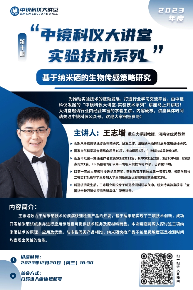 中鏡科儀大講堂-實驗技術系列視頻回放 第十期:基于納米硒的生物傳感策略研究 為推動實驗技術的蓬勃發展,打造行業學習交流的平臺,由中鏡科儀發起的2023年“中鏡科儀大講堂”第十期-“實驗技術系列”講座圓滿結束! 近年來,納米硒在抗菌方面的應用被廣泛研究,納米硒作為廣譜抗菌劑具有巨大潛力,對病原細菌、真菌和寄生蟲具有重要的抗菌活性。本期特邀王志增教授為我們帶來了《基于納米硒的生物傳感策略研究》的專題講座。講座圍繞納米硒的三項技術創新展開深入探討,并分享了他在納米硒醫學生物傳感研究方面所取得的最新研究成果和應用實例。內容詳實,深入淺出,精彩非凡! 現將本期講座回放發布,供大家學習,歡迎大家觀看!