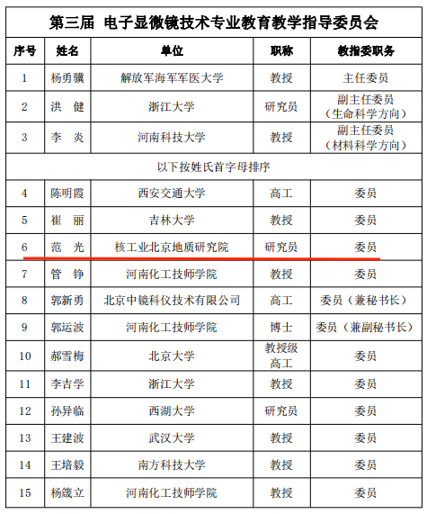 3月2日,由谷湘平博士和楊和雄博士及李婷博士聯合申報,以核工業北京地質研究院、第三屆電子顯微鏡技術專業教育教學指導委員會委員(簡稱教指委)范光研究員命名的新礦物——范光鉬礦(Fanguangite),獲國際礦物學會新礦物命名及分類委員會全票通過,批準編號:IMA-2023-112。 范光鉬礦的化學式為(MoO2)(PO3OH)·4H2O,三斜晶系,空間群Pˉ1, 產于美國猶他州中部馬里斯維爾鈾-鉬礦區的自由2號礦。范光鉬礦以核工業北京地質研究院礦物學家范光研究員命名(圖1)。 圖1 2023年范光研究員接受央視記者采訪 范光鉬礦是具有全新化學成分和晶體結構的磷鉬酸鹽新礦物,晶體中MoO5H2O八面體和PO3OH四面體互聯形成雙鏈構造,鏈間分布通道水,鏈間通道水和晶體結構對環境溫度和濕度極為敏感,揭示了新的礦物晶體化學現象,預示其在醫藥、化工、環保領域中具有重要的應用潛力。范光鉬礦屬于鈾-鉬礦床淺部的次生礦物,其中的鉬與磷是重要的工農業原料,有著廣泛的應用范圍。 圖2 范光鉬礦的標本(藍鉬礦基質中灰白色片狀范光鉬礦晶體)及范光鉬礦單晶體顯微鏡圖像 圖3 范光鉬礦晶體結構中的鏈狀構造及鏈間的通道水 范光研究員1985年畢業于成都地質學院,隨后進入核工業北京地質研究院工作,是我國杰出的電子探針和鈾礦物專家,對欒氏鋰云母、氧鈉細晶石、冕寧鈾礦、嫦娥石、鈮包頭礦等十多種新礦物的發現和研究做出了重要貢獻。作為河南化工技師學院與中鏡科儀集團聯合創辦的電鏡技術專業的第三屆教指委委員,范光研究員積極推動電鏡專業的學科建設與教學改革,進一步提高人才培養質量,為專業建設和發展作出了貢獻。 第三屆電子顯微鏡技術專業教育教學指導委員會名單