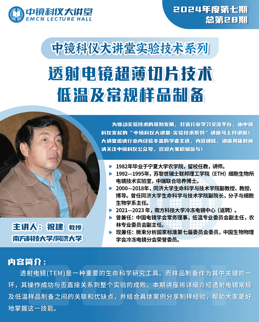 2024年“中鏡科儀大講堂”第七期-“實驗技術系列”講座將于2024年10月17日18:30開講。本期由祝建教授帶來的《透射電鏡超薄切片技術—低溫及常規樣品制備》專題講座。本期講座將詳細介紹透射電鏡常規及低溫樣品制備之間的關聯和優缺點,分享制樣經驗,幫助大家更好地掌握這一技能。歡迎大家積極參與,共同推動實驗技術的發展! 講座時間: 2024年10月17日(周四)18:30 參會方式: 騰訊會議室(或企業微信會議室)號:54671480846 掃碼進入微信視頻號 掃碼關注中鏡科儀