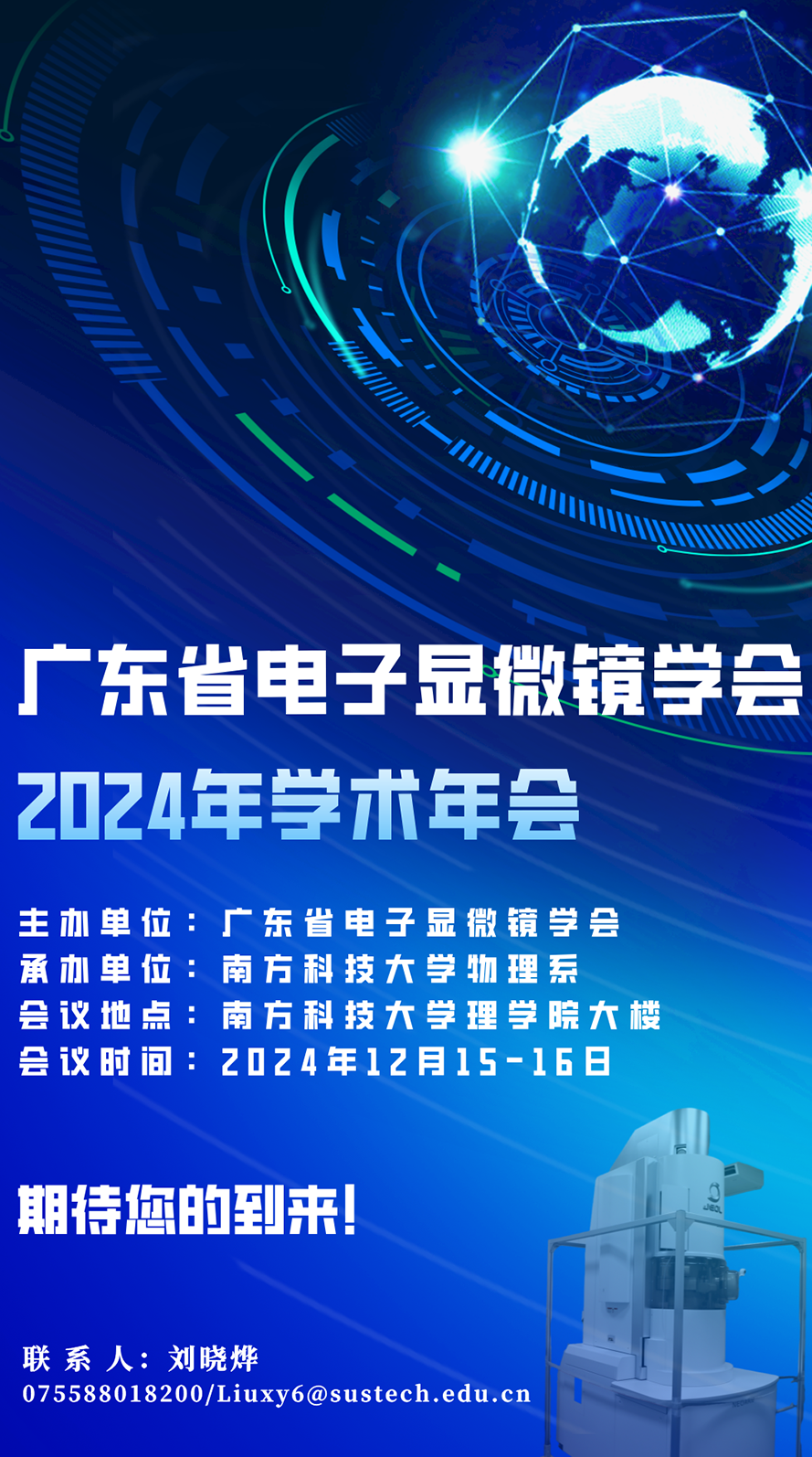 為推動廣東省電子顯微分析技術(shù)的發(fā)展,加強(qiáng)電子顯微分析工作者的學(xué)術(shù)交流與合作,提高自主創(chuàng)新能力,提升電子顯微鏡管理和應(yīng)用水平,廣東省電子顯微鏡學(xué)會定于2024年12月16日在南方科技大學(xué)舉辦“廣東省電子顯微鏡學(xué)會2024年學(xué)術(shù)年會”。現(xiàn)將有關(guān)會議事項通知如下: 一、組織架構(gòu) 主辦單位:廣東省電子顯微鏡學(xué)會 承辦單位:南方科技大學(xué)物理系、南方科技大學(xué)冷凍電鏡中心 二、會議內(nèi)容 1.專題學(xué)術(shù)報告 會議將邀請著名學(xué)者參加會議并作大會特邀報告和分會場特邀報告。內(nèi)容涵蓋:各類電鏡、光鏡等在物理學(xué)、材料科學(xué)、生命科學(xué)、醫(yī)學(xué)、化學(xué)化工、環(huán)境科學(xué)、地質(zhì)等科學(xué)領(lǐng)域中的應(yīng)用研究;電鏡平臺建設(shè)、實驗室管理的經(jīng)驗交流;實驗技術(shù)方法發(fā)展與進(jìn)步;儀器設(shè)備功能開發(fā)與維護(hù)等。 2.新型儀器設(shè)備技術(shù)介紹 各類電鏡、電鏡制樣設(shè)備、光電聯(lián)用、數(shù)據(jù)分析處理系統(tǒng)等相關(guān)最新設(shè)備技術(shù)發(fā)展報告或展示。 3.學(xué)會年度總結(jié) 三、時間及地點(diǎn) 時間:2024年12月16日 08:30-18:00 地點(diǎn):南方科技大學(xué)理學(xué)院大樓 四、會議報名 歡迎我省電鏡同行及實驗室老師們報名參加,請于11月10日前通過鏈接: https://www.wjx.cn/vm/OYvLQgc.aspx#,或掃描下方二維碼,完成注冊。請參加人員填寫詳細(xì)信息和擬報告題目,以便安排及發(fā)放第二輪會議通知。 五、會議費(fèi)用 本次與會的學(xué)會會員無需繳納會務(wù)費(fèi),會期一天,交通等費(fèi)用自理。 六、會議聯(lián)系人 劉曉燁:總協(xié)調(diào)、展商 0755-88018200 Liuxy6@sustech.edu.cn/15815561162(僅限微信) 劉亞磊:會務(wù)、學(xué)會會員 0755-88018203 liuyl2021@sustech.edu.cn 梁曉璐:特邀報告 0755-88018748 liangxl@mail.sustech.edu.cn 歡迎大家踴躍報名參加!